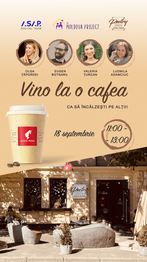 Evenimentul caritabil “Vin-o la o cafea ca să încălzești pe alții!” va avea loc la data de 18 septembrie, orele 11:00 – 15:00, în incinta localului Poetry Coffee Shop (Bd. Ștefan cel Mare și Sfînt 119). Scopul evenimentului este de a colecta resursele necesare de a aproviziona cu lemne de iarnă circa 30 de familii social-vulnerabile ce trăiesc în mediul rural la limita subzistenței.